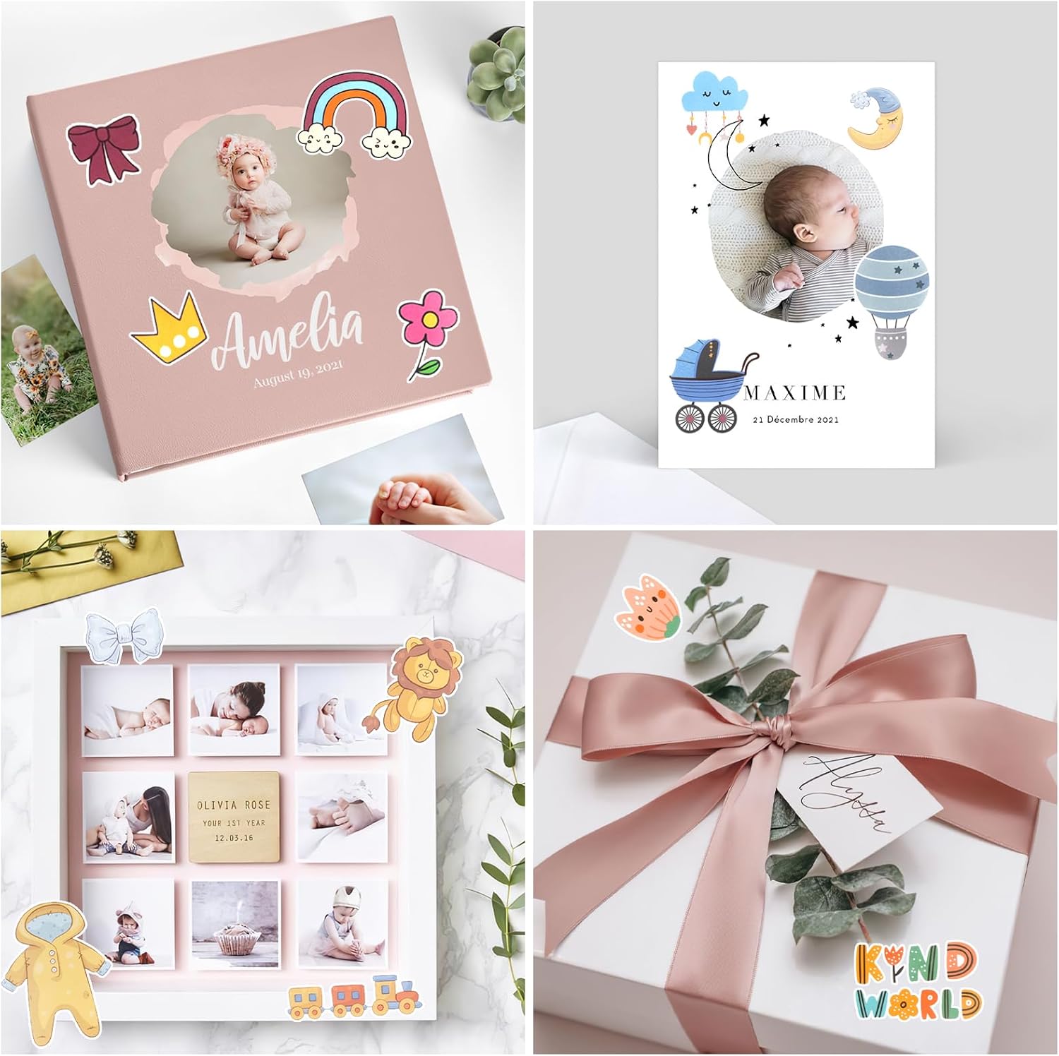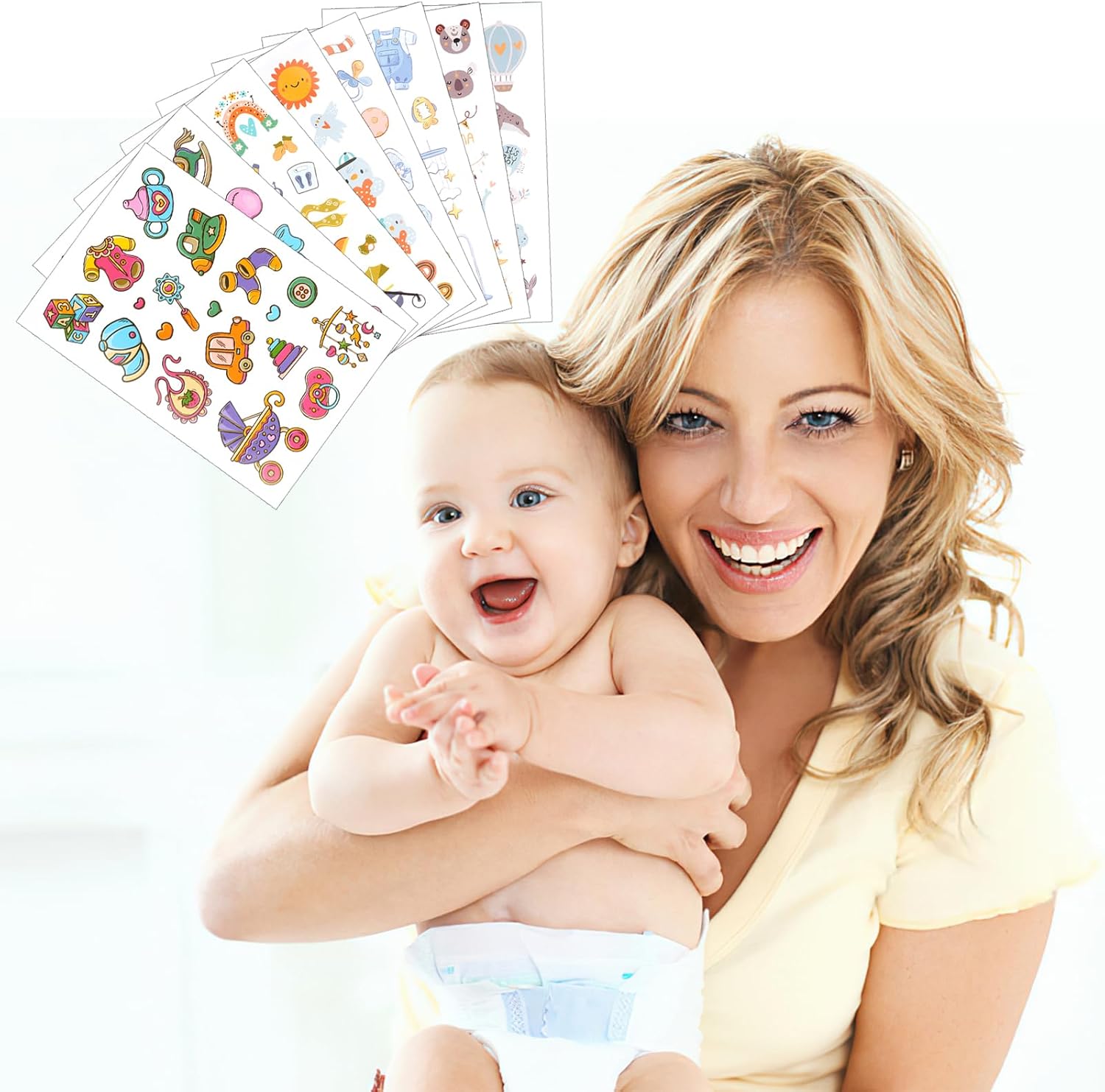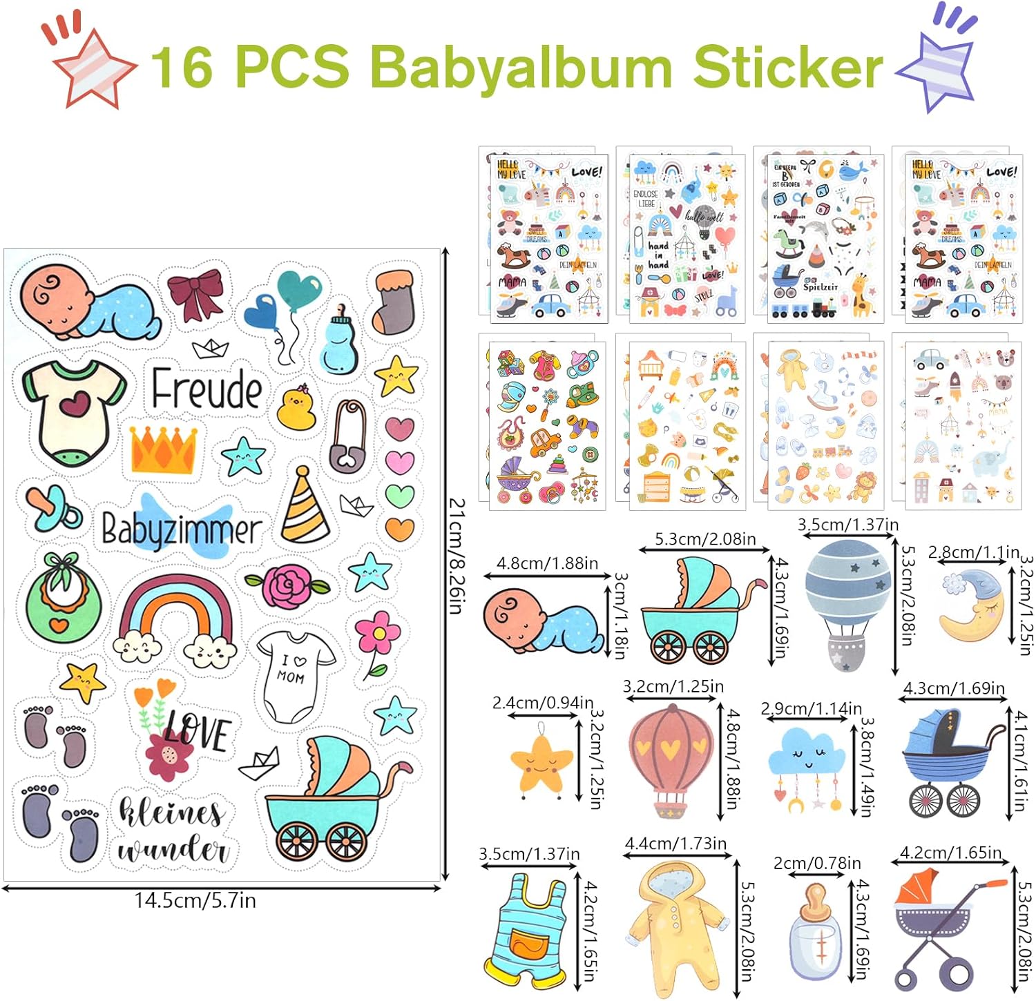 Sammeln Sie mit unserem 361 Stück Babyalbum-Aufkleber-Set die schönsten Momente Ihres Kindes. Die Sticker in liebevoll gestalteten Designs, darunter Kinderwagen, Herzen, Flaschen und Regenbogen, bieten eine ausreichende Menge, um das Wachstum Ihres Babys aufzuzeichnen.