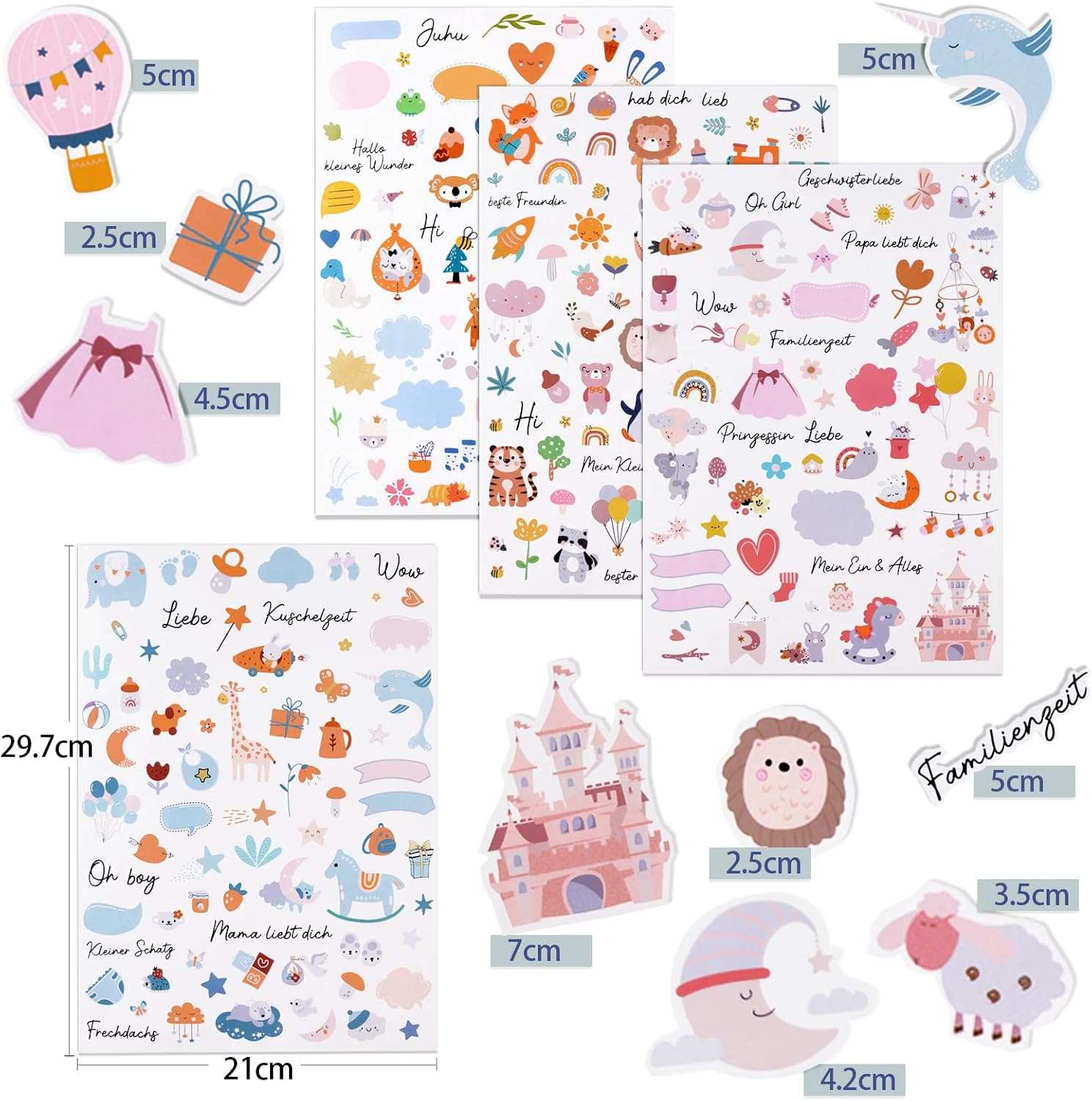 Die Größe jedes Blattes beträgt 21x29.7cm, perfekt für die Verwendung in Fotoalben, Gästebüchern, Notizbüchern, Tagebüchern, Terminkalendern und Geschenkverpackungen. Die bunten Aufkleber mit Motiven von Neugeborenen, Tieren und Kinderliebe machen sie zu einer idealen Ergänzung für Scrapbooking-Projekte.