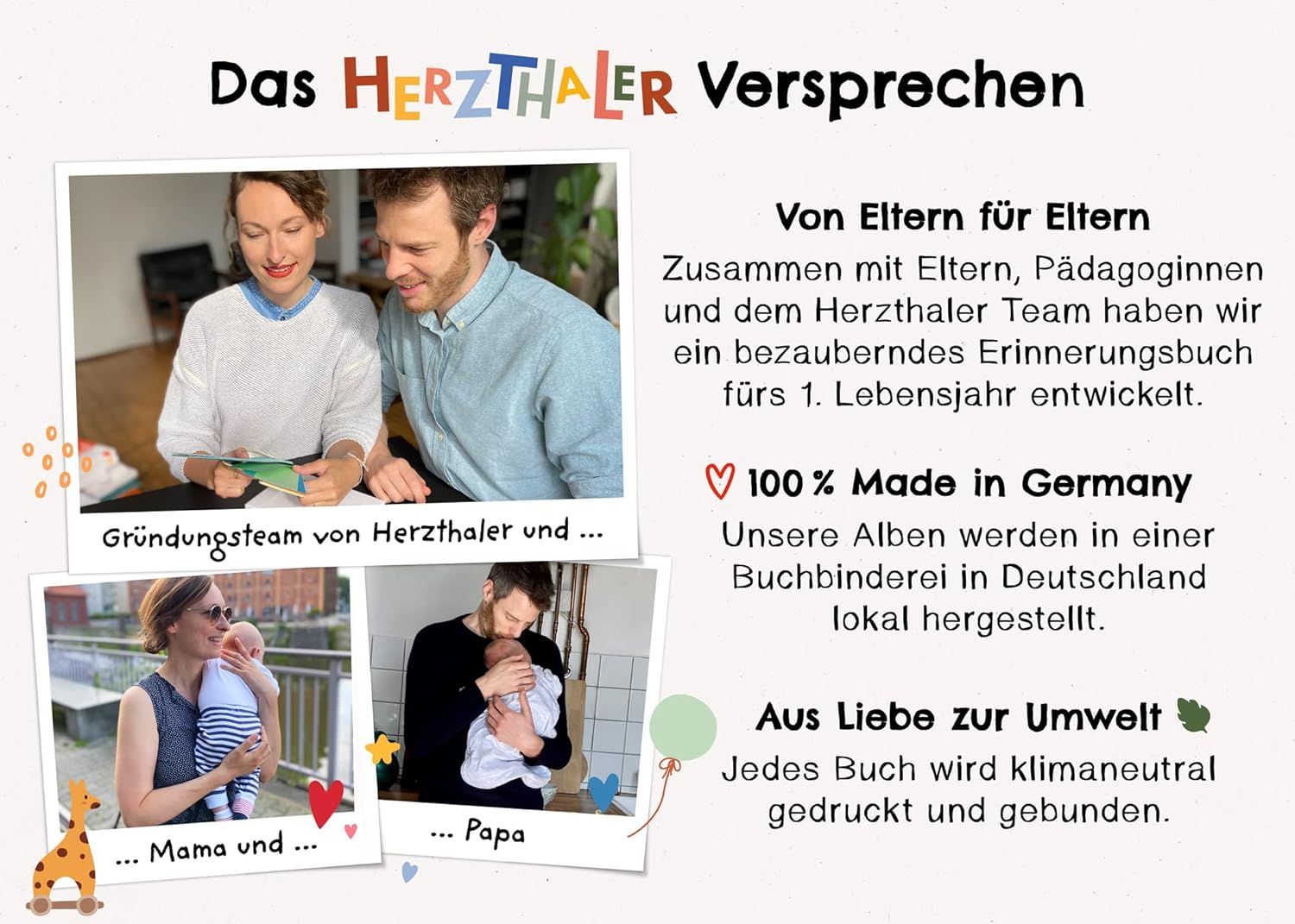 Ob als Geschenk zur Geburt oder Schwangerschaft, als Präsent zum Baby für Mutter und Vater oder als Geschenkidee zur Babyparty und Babyshower: Mit diesem Geburtsgeschenk macht man immer eine Freude. Hergestellt in Deutschland, wurde das Babytagebuch fürs 1. Jahr mit viel Liebe in unserem Familienunternehmen gestaltet und in einer lokalen Buchmanufaktur klimaneutral produziert.