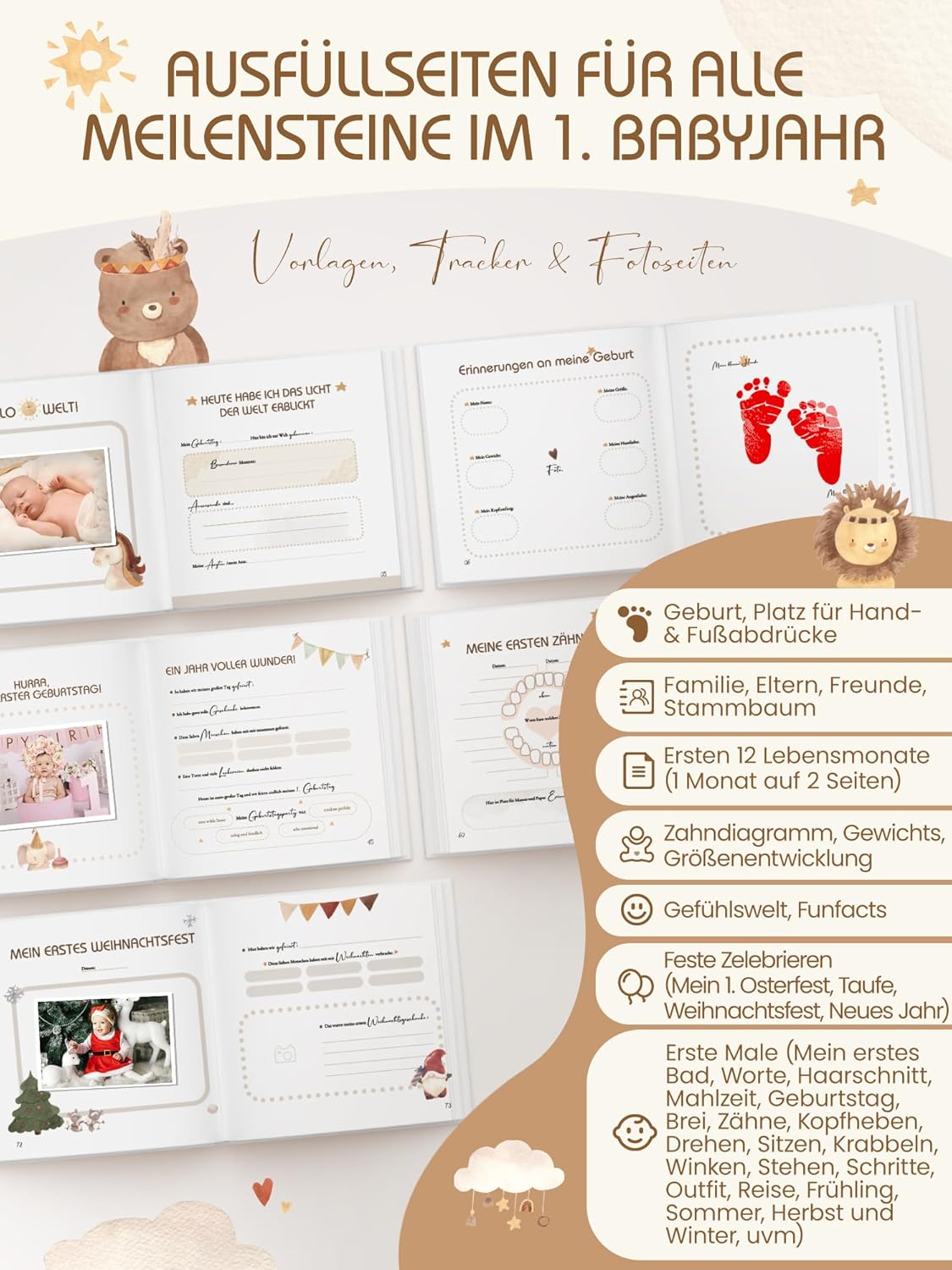 - Erfassen Sie den Namen Ihres Babys, Geburt, Hand- und Fußabdrücke, die ersten Wochen und Monate, erste Worte, Bad, Kopf heben, Drehen, Krabbeln, Stehen, Haarschnitt, Reisen, besondere Feste und vieles mehr.