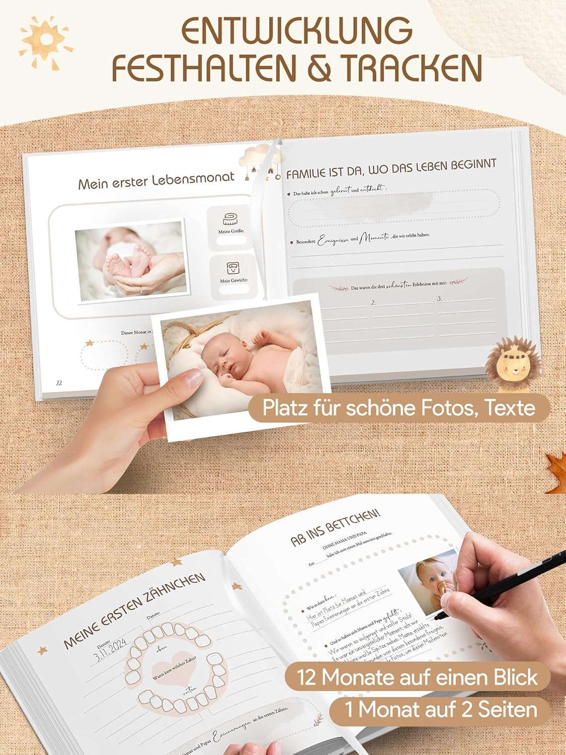 - Es lässt sich frei mit Texten und Fotos gestalten, ganz entsprechend der Entwicklung Ihres kleinen Lieblings.