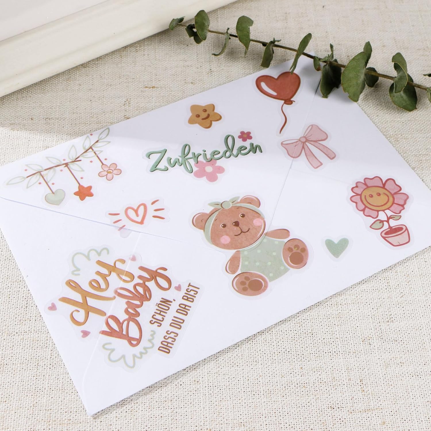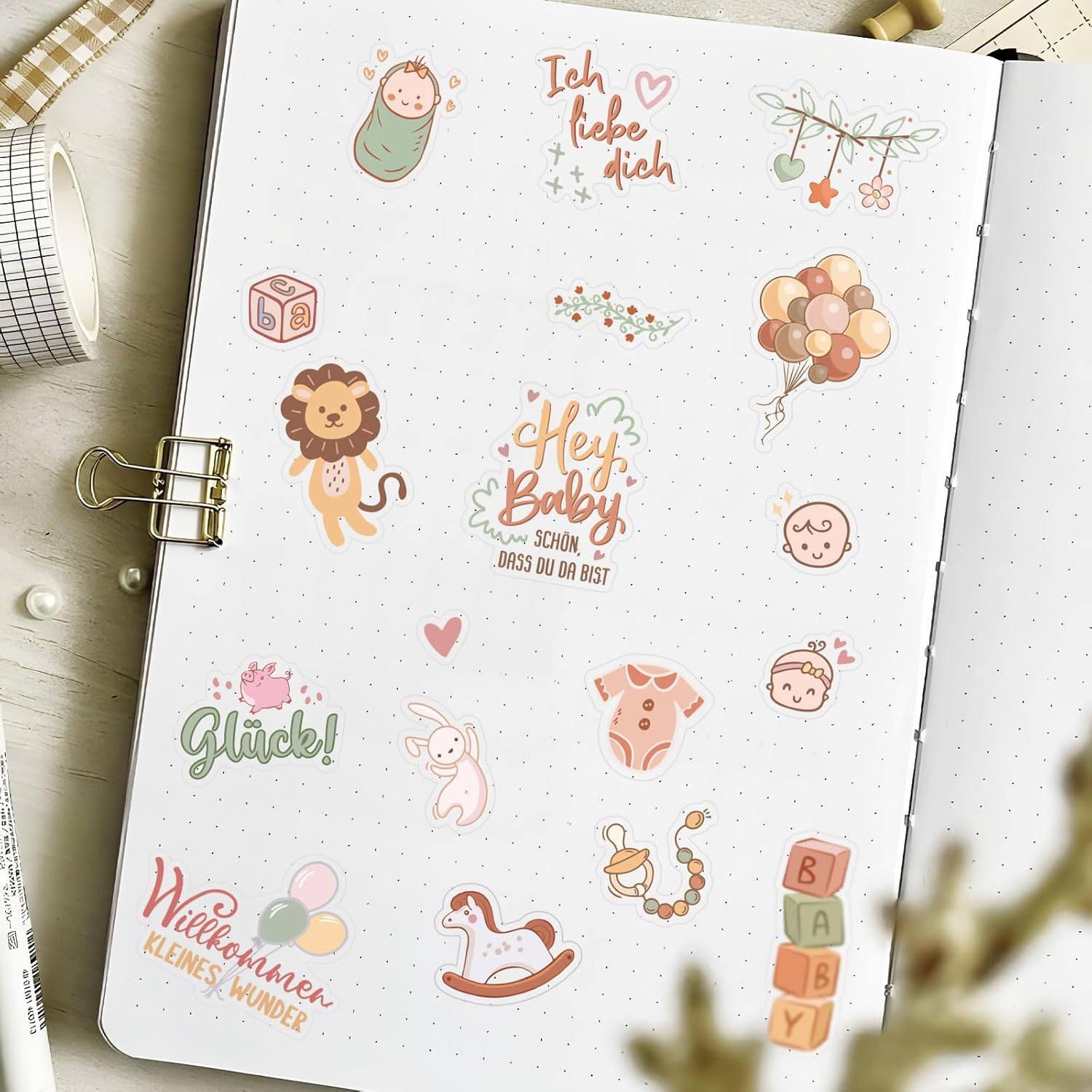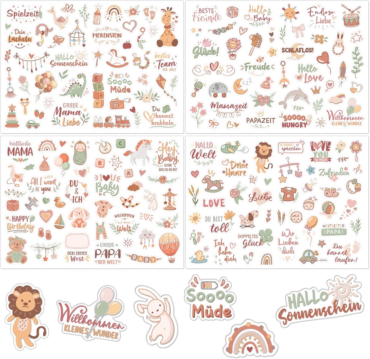 Bitte beachten Sie die detaillierte Größenangabe im Bild. Das Produkt ist extra breit und wiegt 90g. Die Sticker sind in einem schönen Scrapbook-Stil gestaltet, der Ihrem Babyalbum eine persönliche Note verleiht.