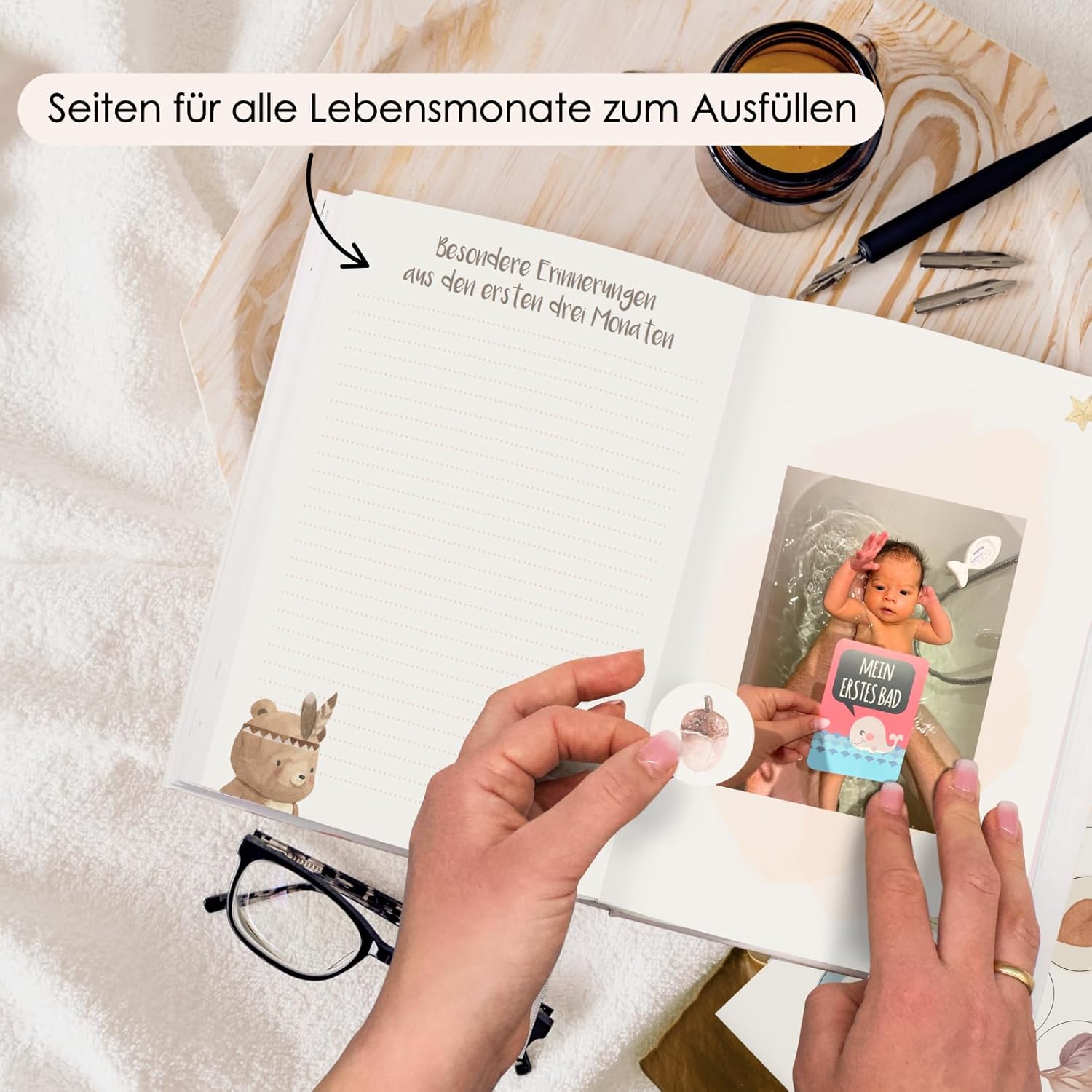 Cozy Racoon Babyalbum 'Mein erstes LebensJahr' - Boho Tiere Design mit 158 Stickern