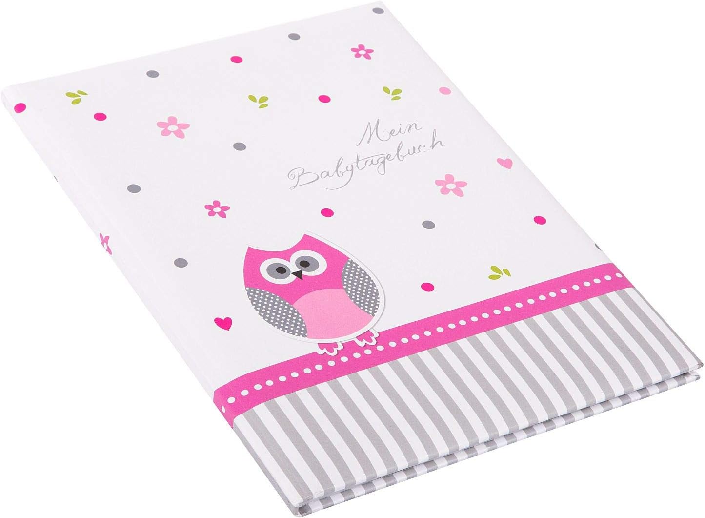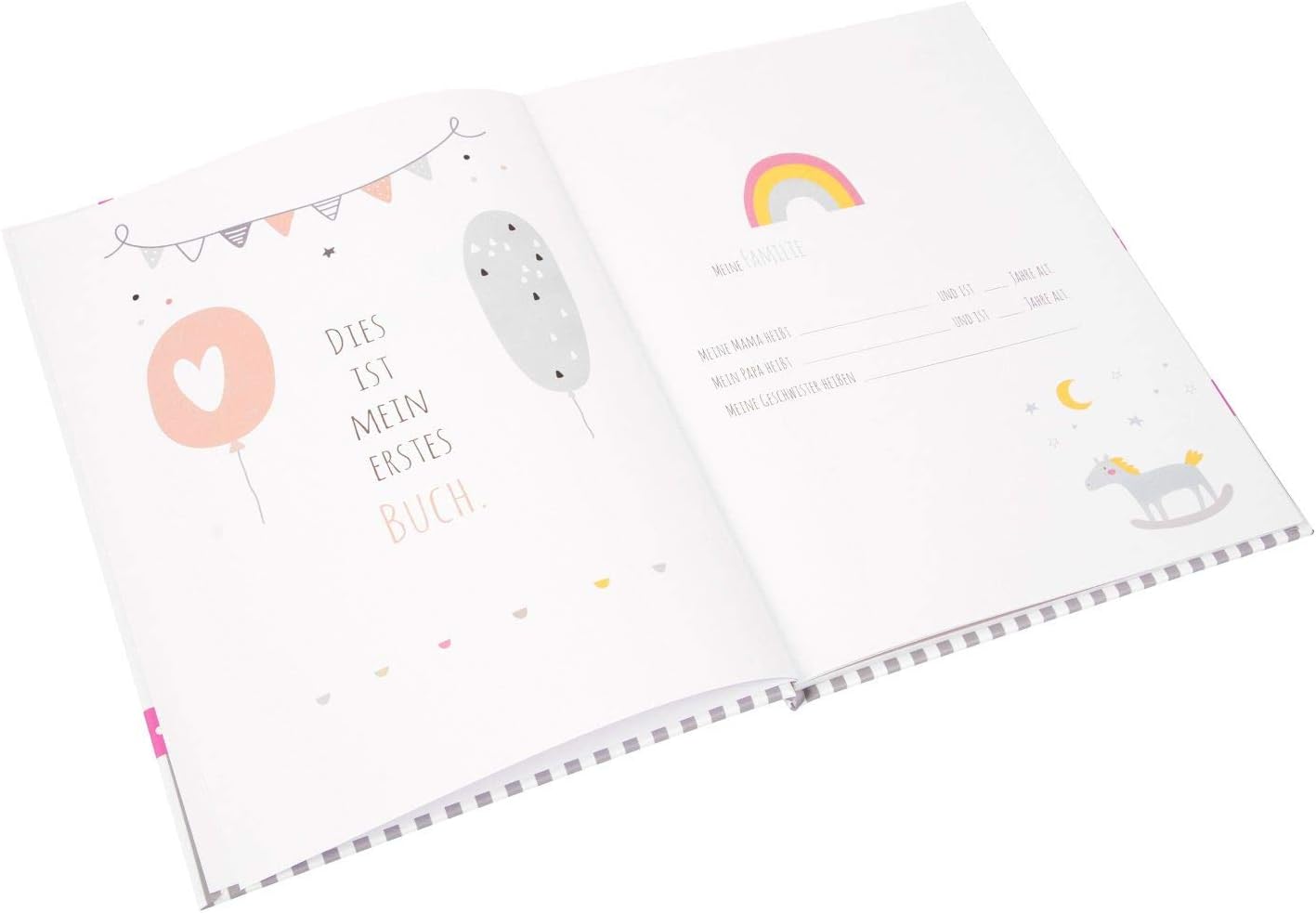 Das Babytagebuch hat die Maße 21 x 28 cm und wiegt 399,16 Gramm. Es kommt in einer schönen Farbkombination aus Weiß und Rosa daher.