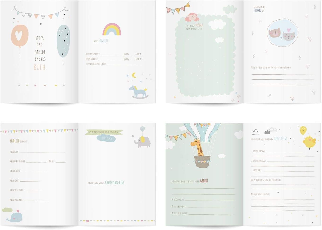 Das Erinnerungsalbum besteht aus hochwertigem Papier und einem stabilen Hardcover. Der Einband ist aus laminiertem Kunstdruck gefertigt und hält somit allen Herausforderungen des Alltags stand. Trotz gefülltem Album weitet es sich nicht aus und behält seine Form. Die Verarbeitung des Babytagebuchs ist made in Germany und zeichnet sich durch eine hochwertige Verklebung der einzelnen Blätter aus. Die Materialien sind umweltfreundlich.
