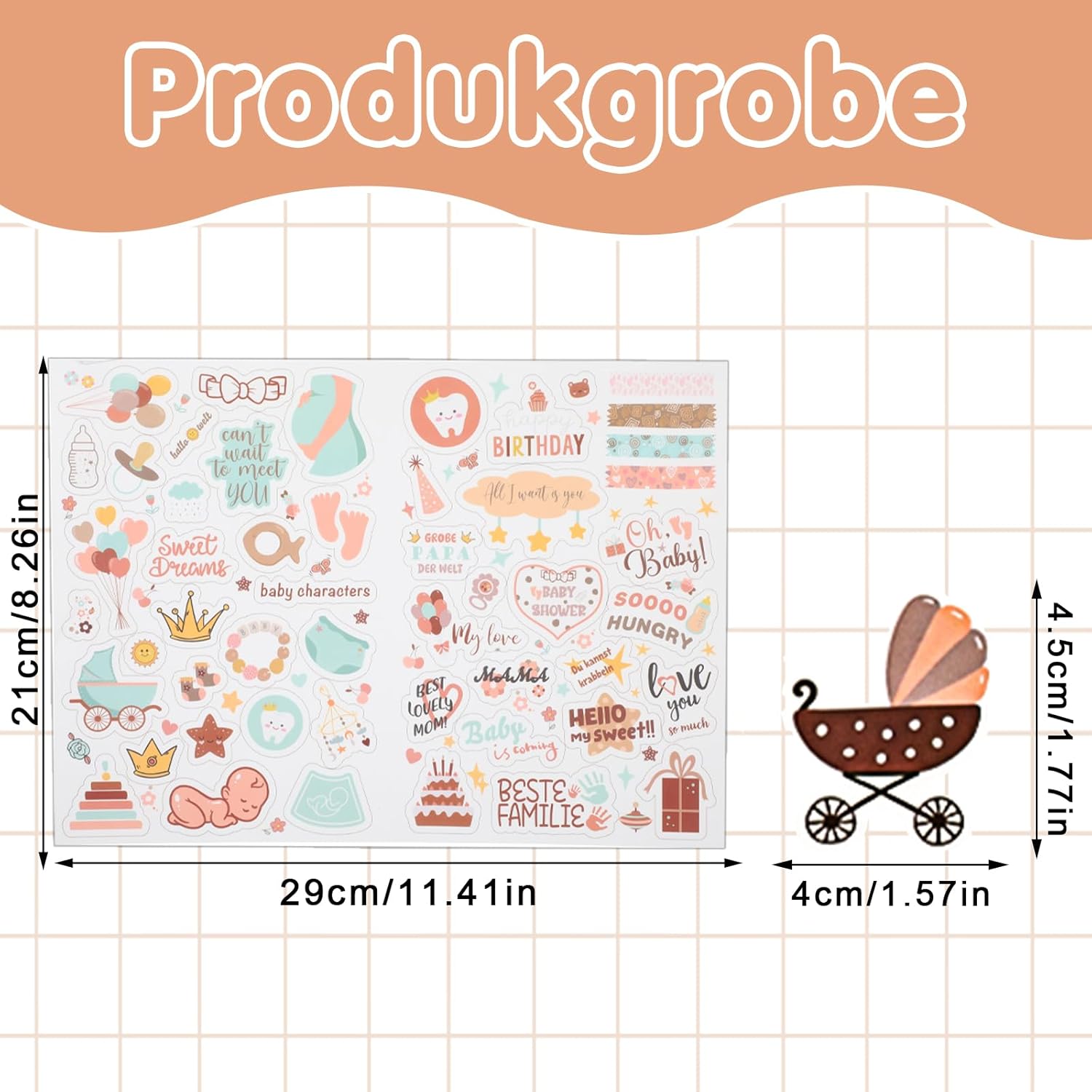 Die enthaltenen Elemente wie Kinderwagen, Spielzeug, Herzen und Sterne sind perfekt zum Dekorieren von Fotoalben, Gästebüchern, Tagebüchern und Grußkarten geeignet. Sie passen auch hervorragend in Kinderzimmer, Kindergärten, Babygeburtstagsfeiern und Babypartys.