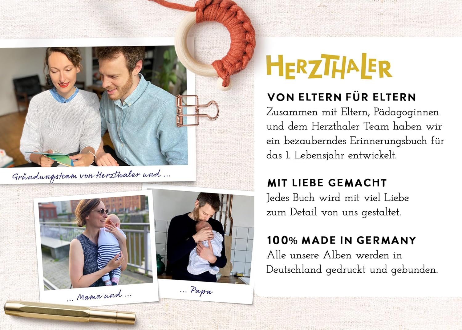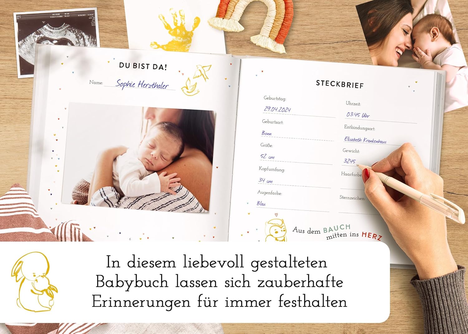 Das Babytagebuch für das erste Jahr wurde mit viel Liebe in Deutschland gestaltet und in einer lokalen Buchmanufaktur produziert.